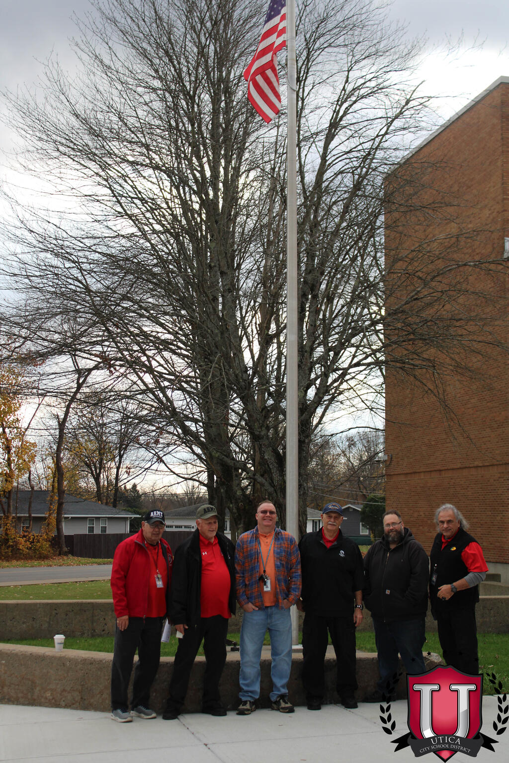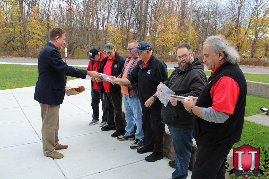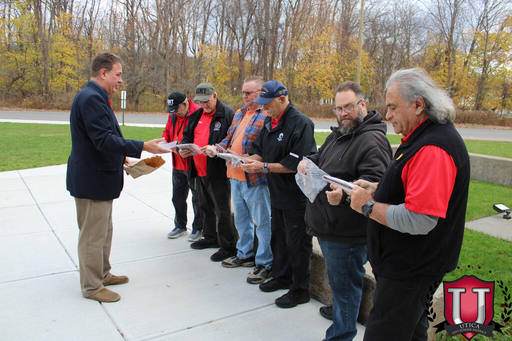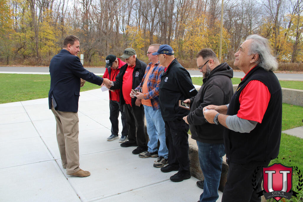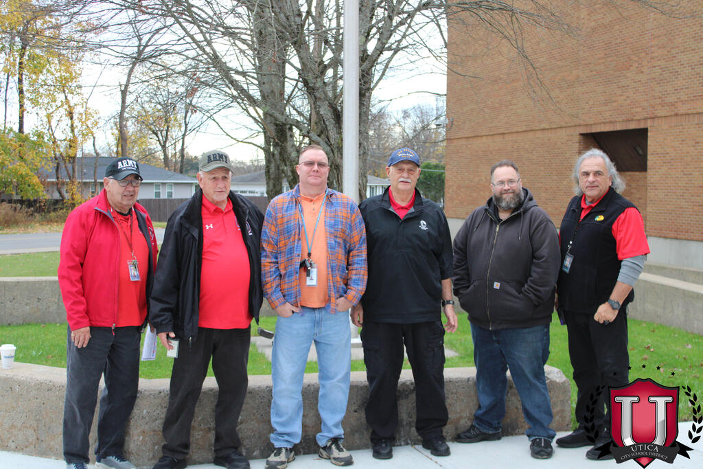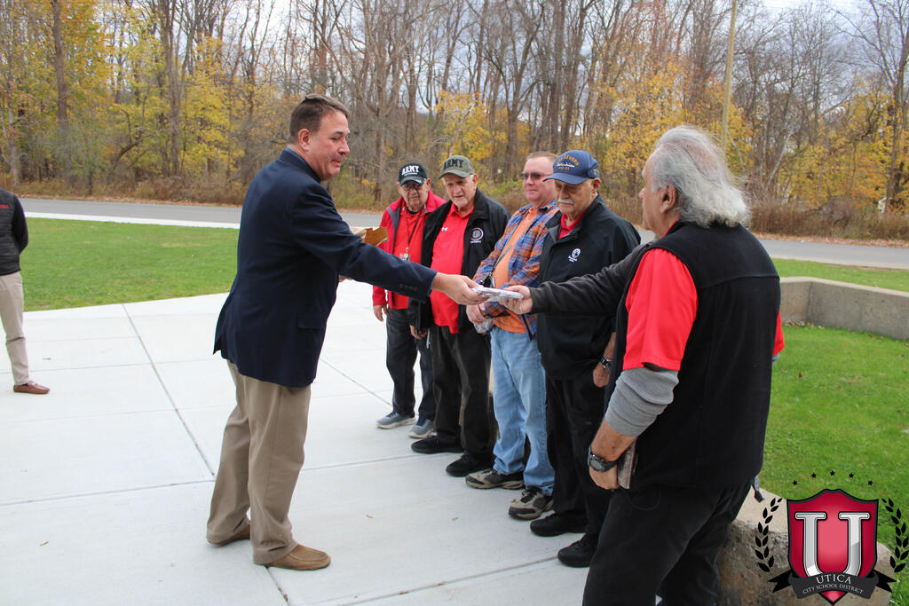 "به مناسبت روز کهنه سربازان، ما هر روز از کهنه سربازانی که همگی تأثیر قابل توجهی بر دانش آموزان و کارکنان اینجا در مدرسه راهنمایی JFK دارند، تجلیل می کنیم. مایلیم به طور رسمی از آقایان تونی دیسپیریتو، جان کاپرارو، و آقایان قدردانی کنیم. . کهنه سربازان در جامعه مدرسه راهنمایی JFK خودمان."